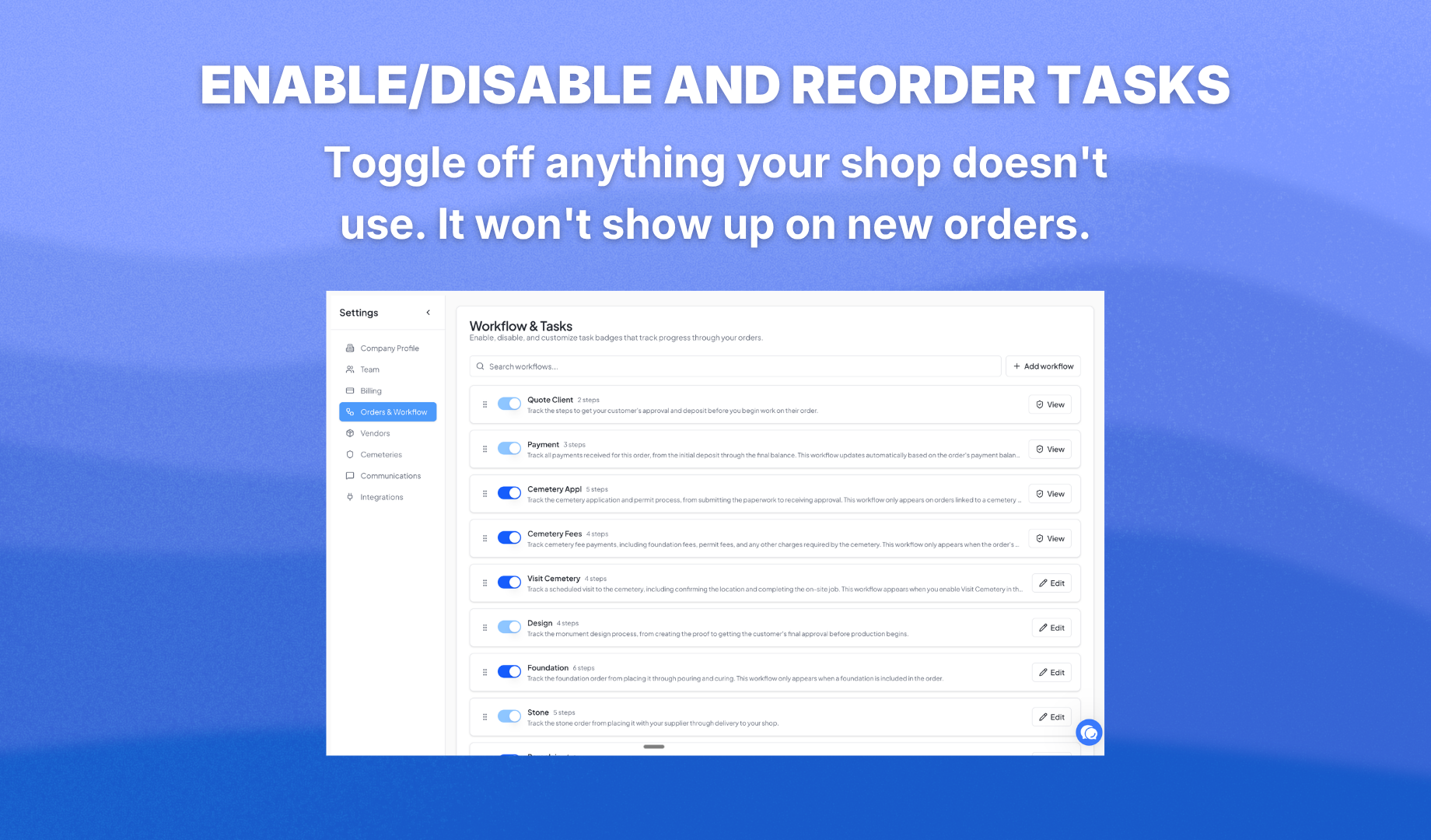 You can also turn off tasks your shop doesn't use. If you don't do foundation work, turn it off and it won't show up on new orders. Four tasks can never be turned off β Quote, Payment, Design, and Stone β because they keep everything else running.